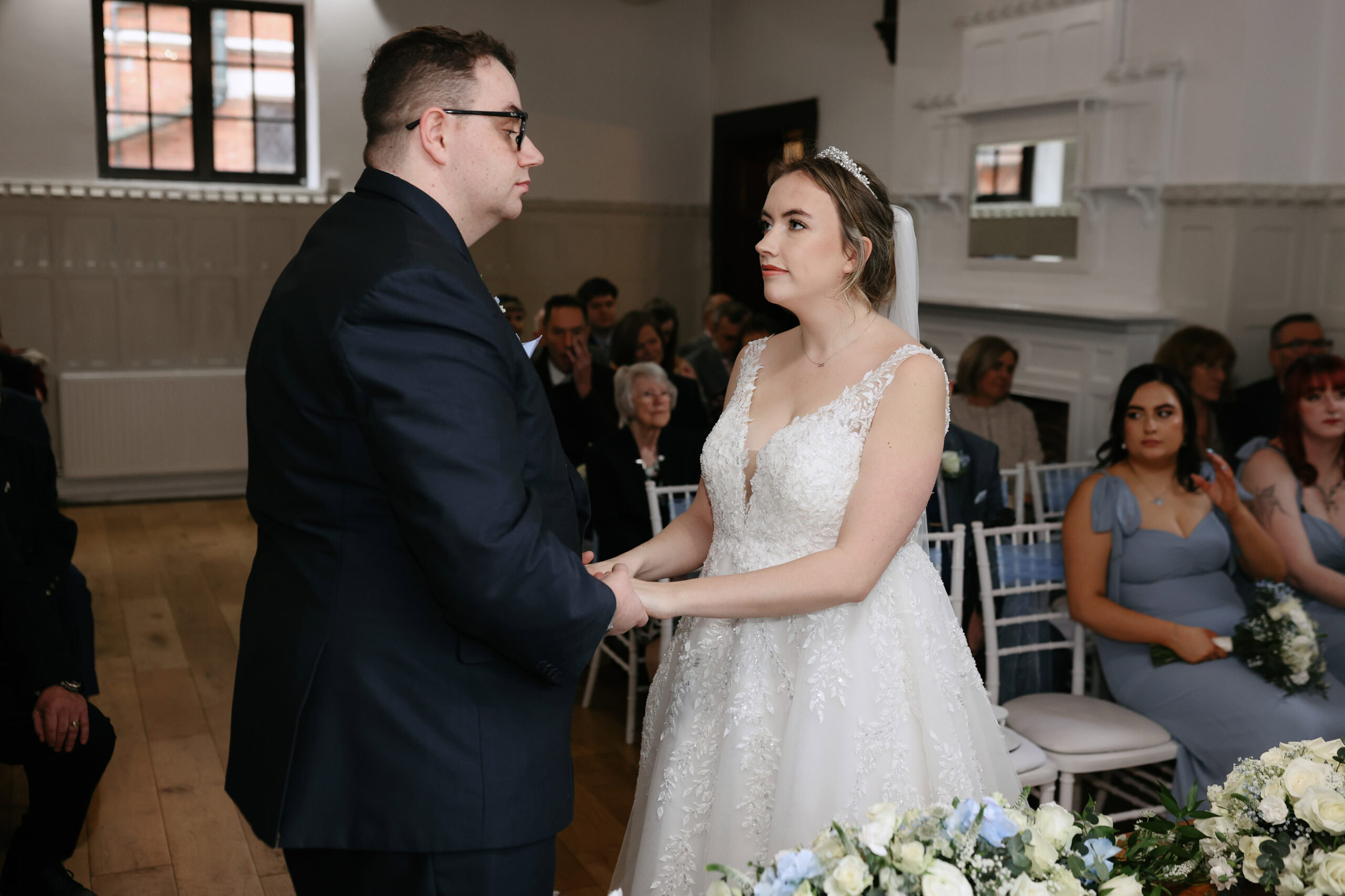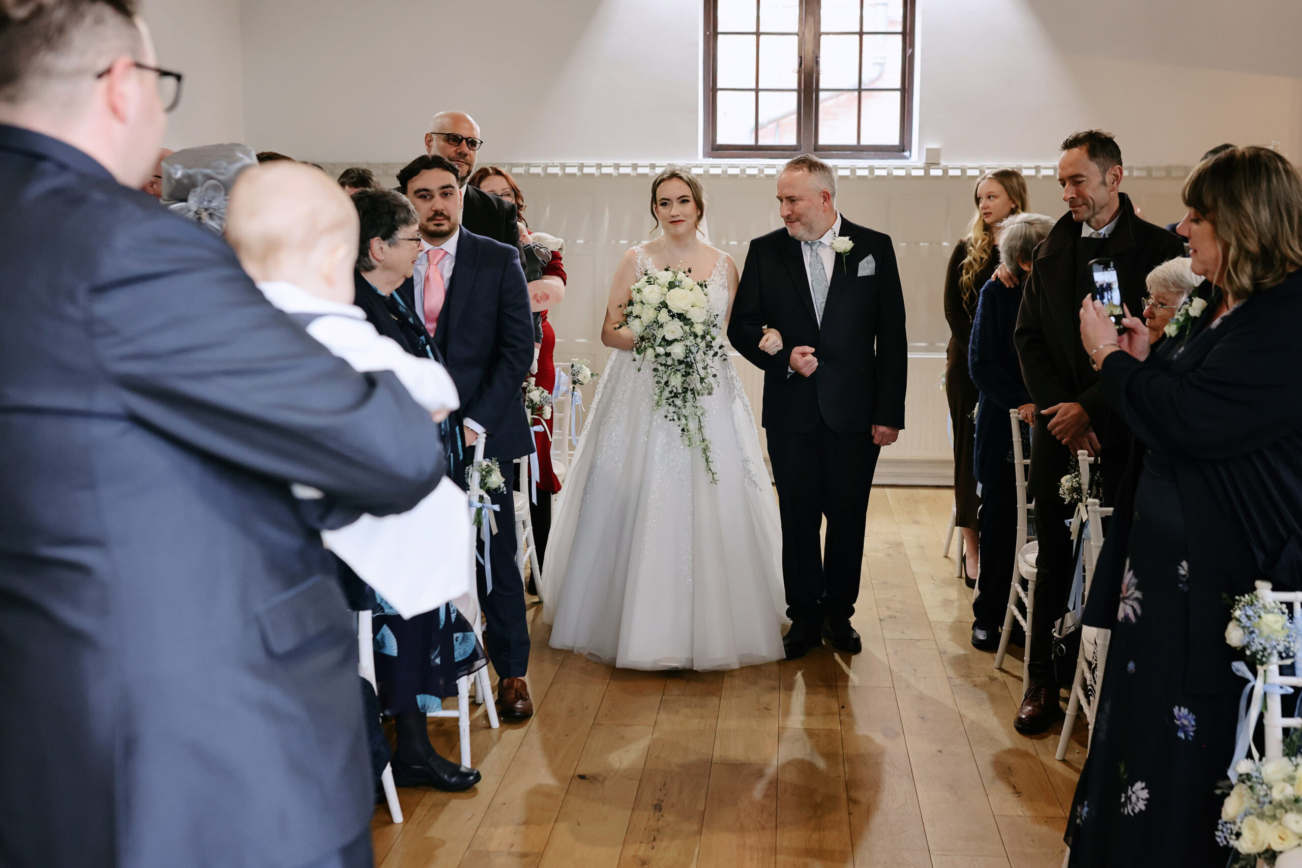 The ceremony took place outside in the Baronial Hall where soft winter light filtered through as friends and family gathered to watch the couple exchange their vows.
