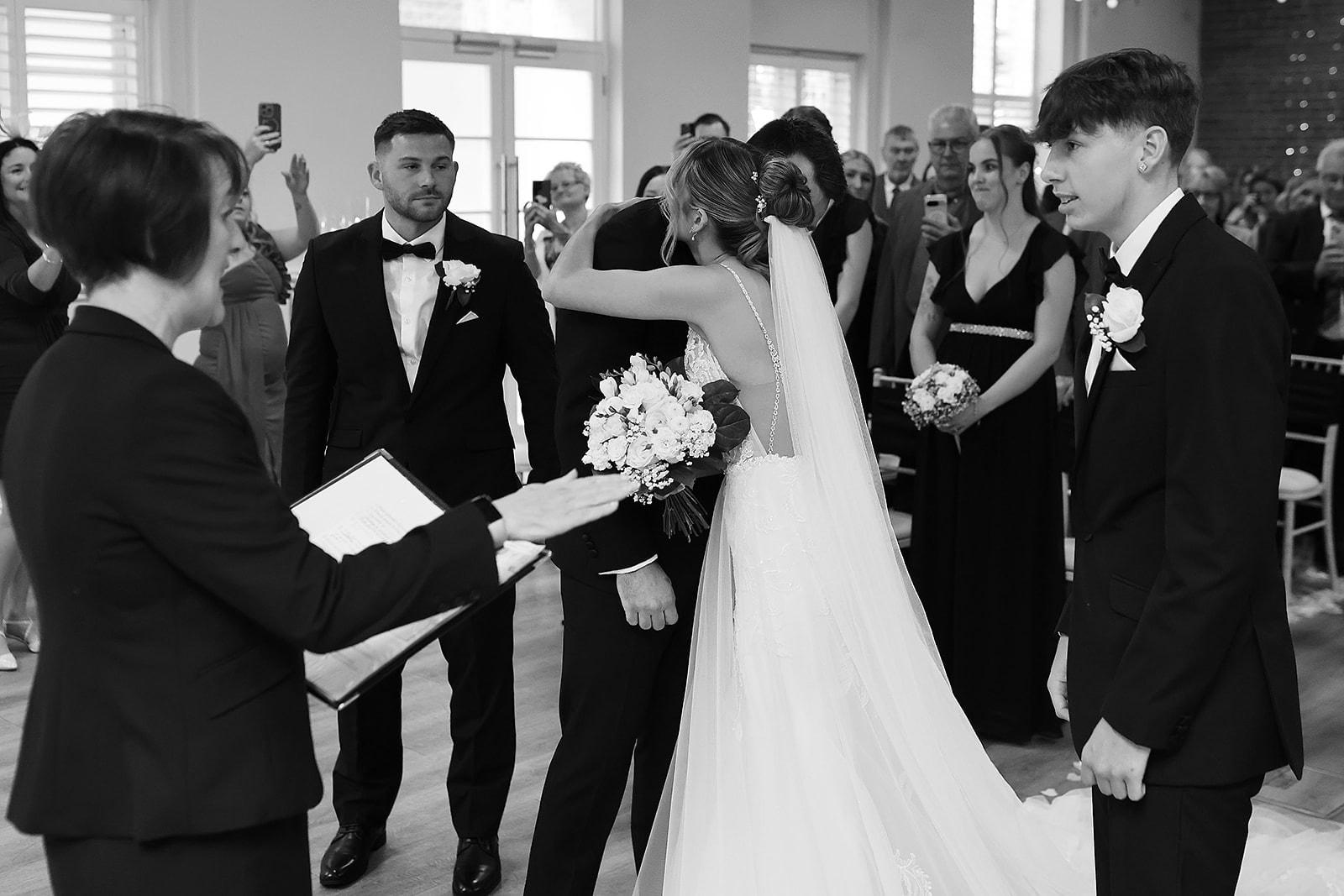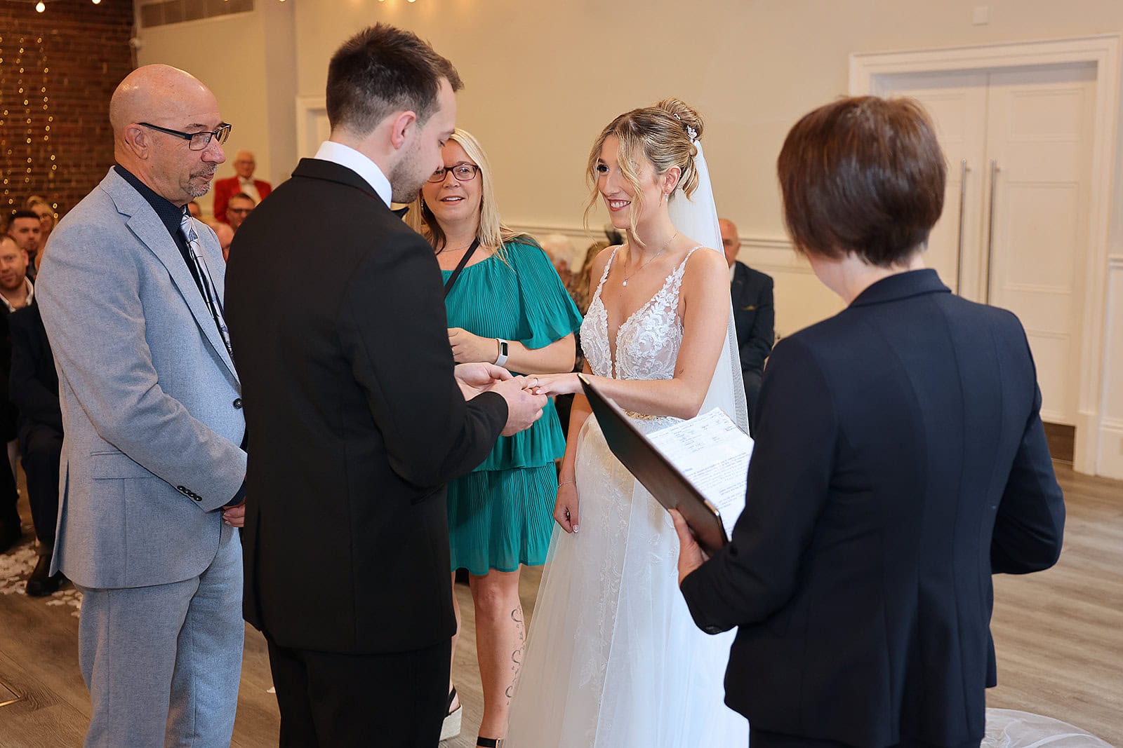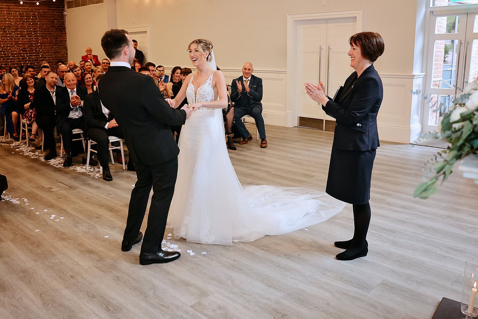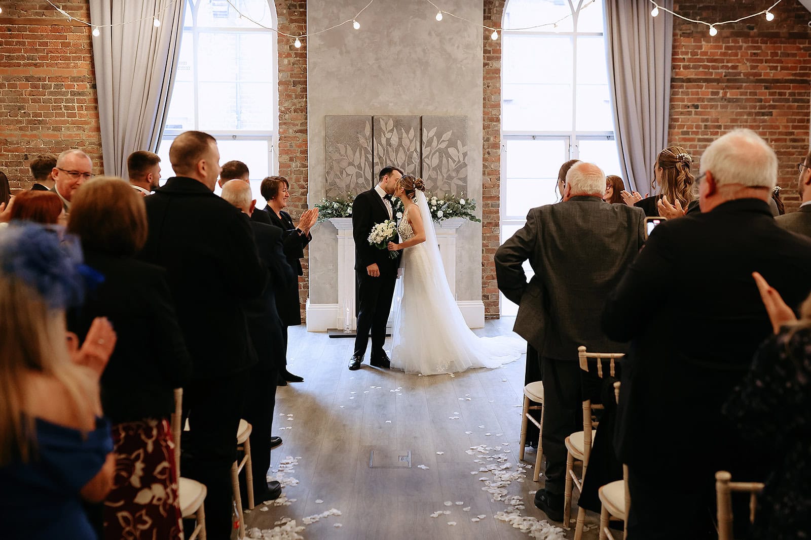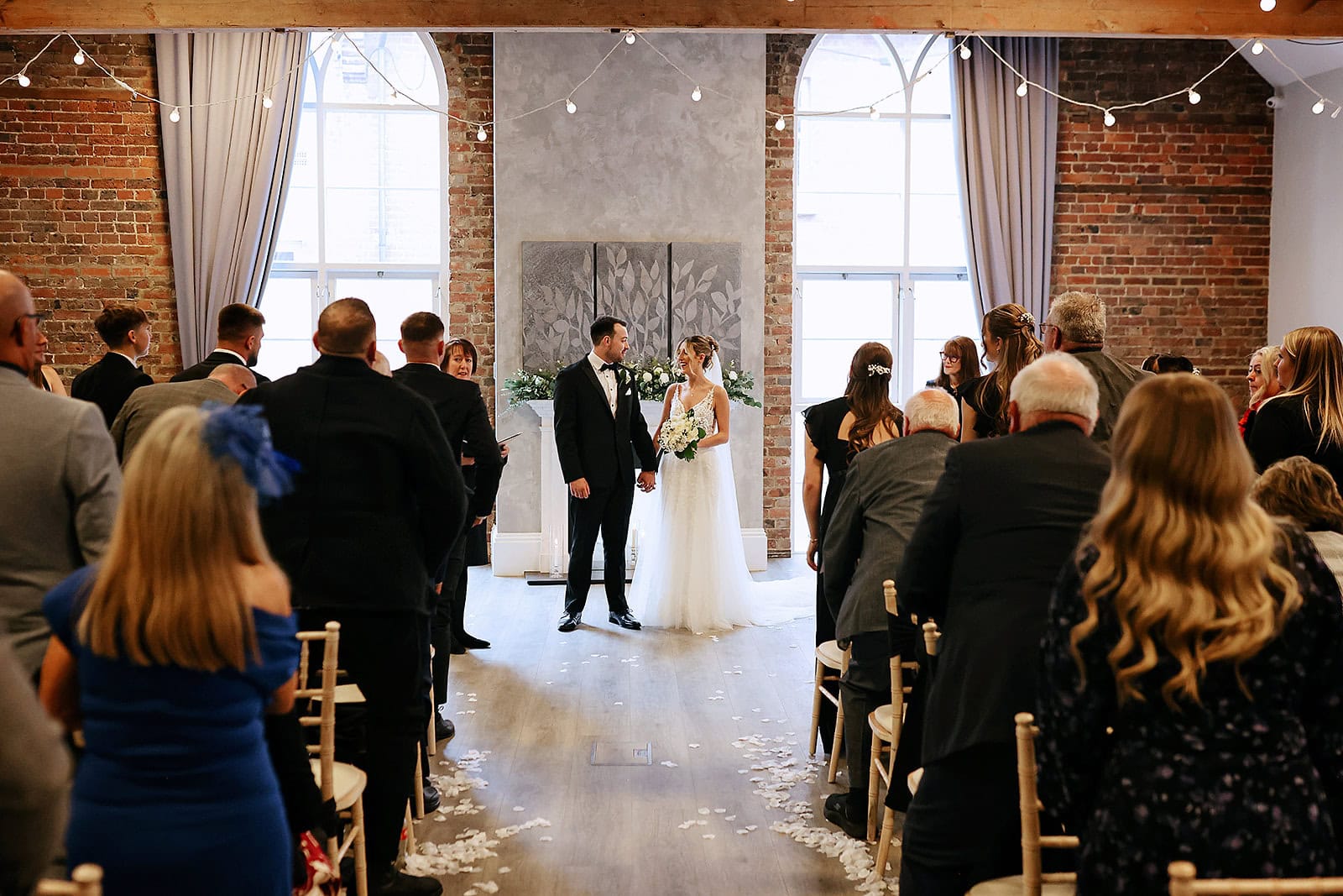 The ceremony took place in the beautifully light-filled Gallery space. As Katie walked down the aisle, the room fell into that quiet, emotional stillness that says everything about the moment. The rings had been placed under two unsuspecting guests chairs who became unexpected ring bearers.