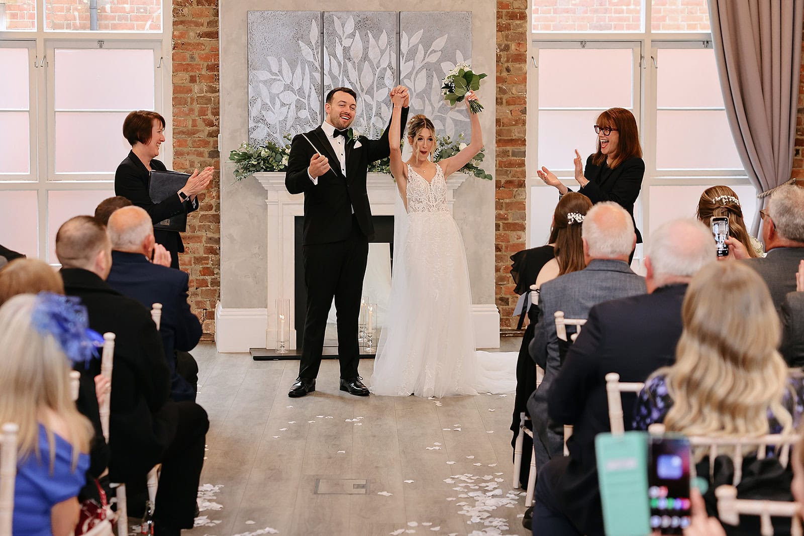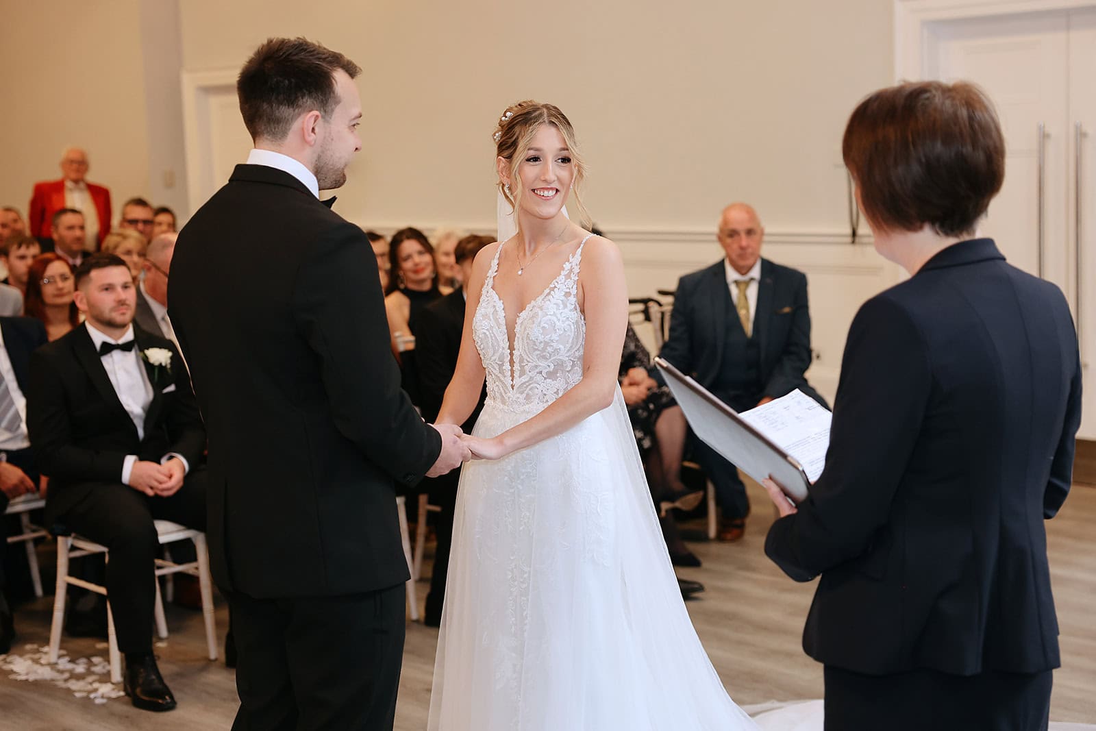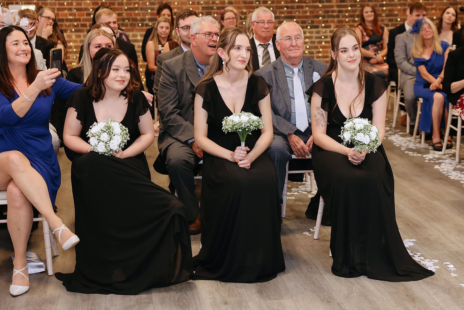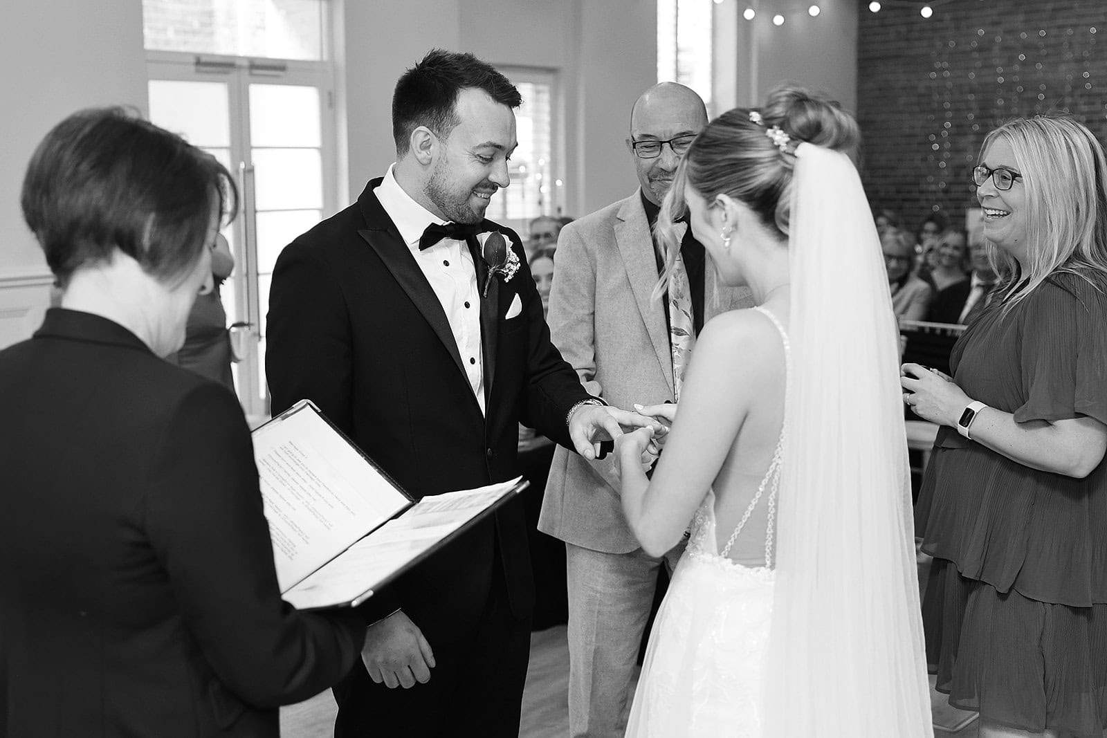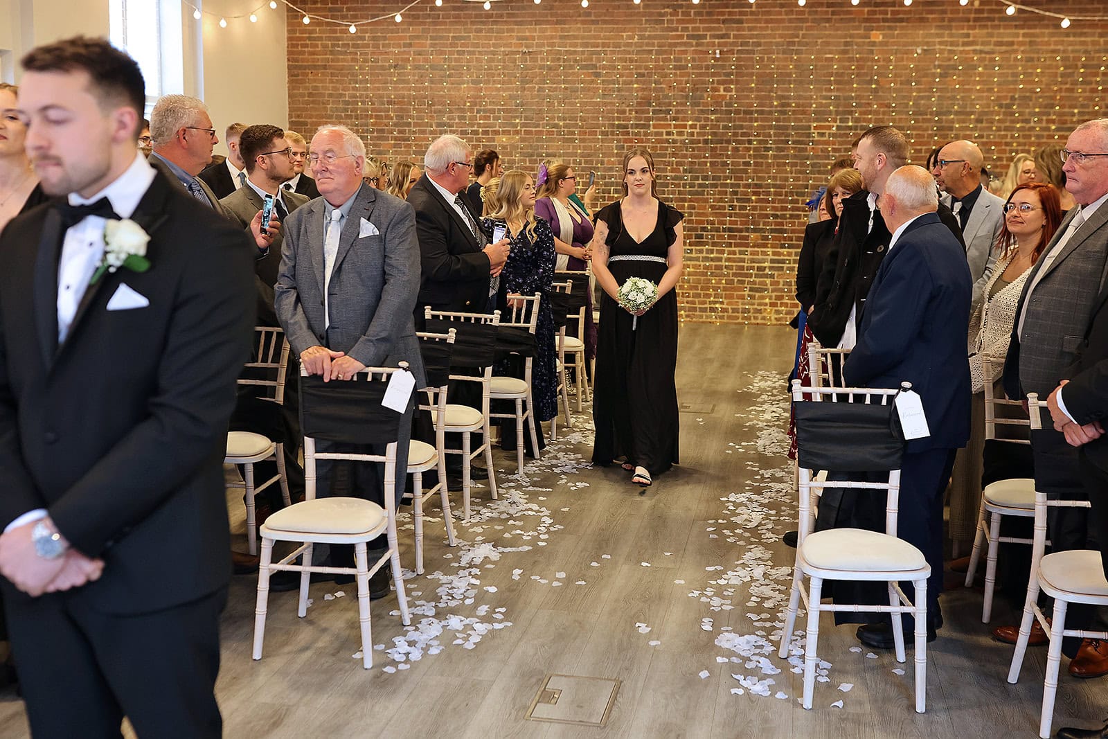 The ceremony took place in the beautifully light-filled Gallery space. As Katie walked down the aisle, the room fell into that quiet, emotional stillness that says everything about the moment. The rings had been placed under two unsuspecting guests chairs who became unexpected ring bearers.