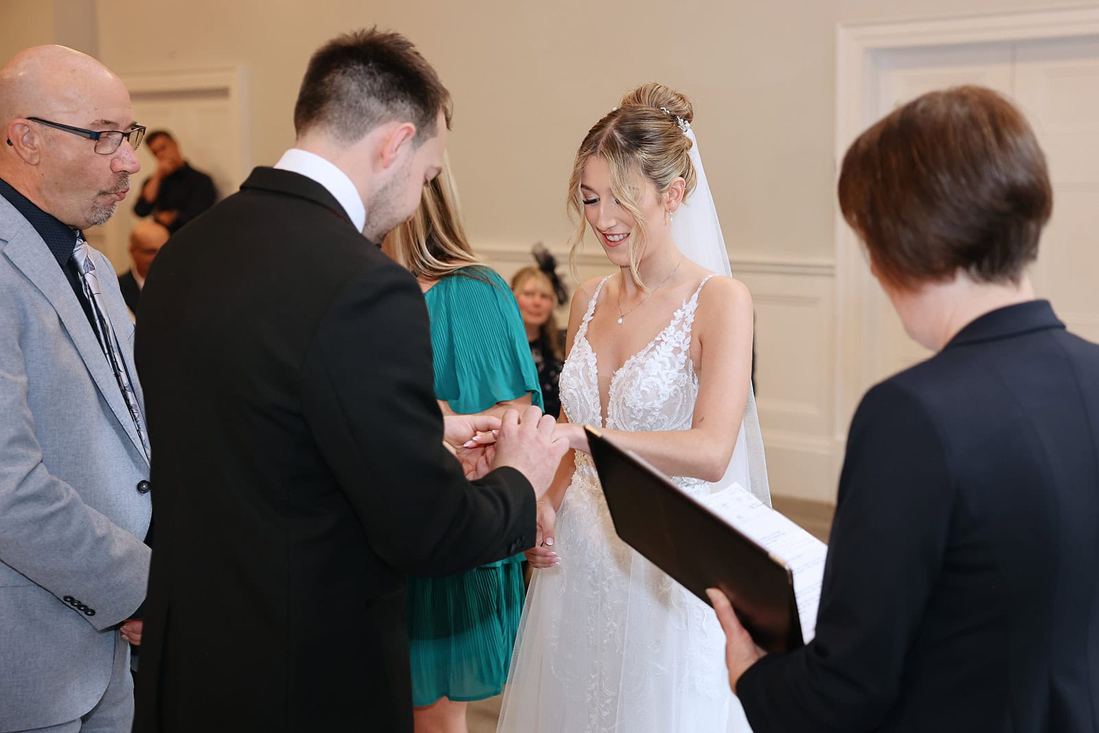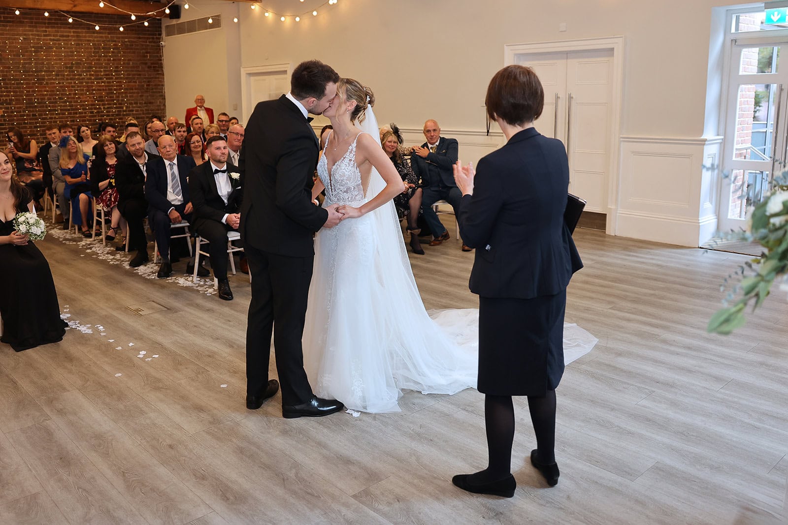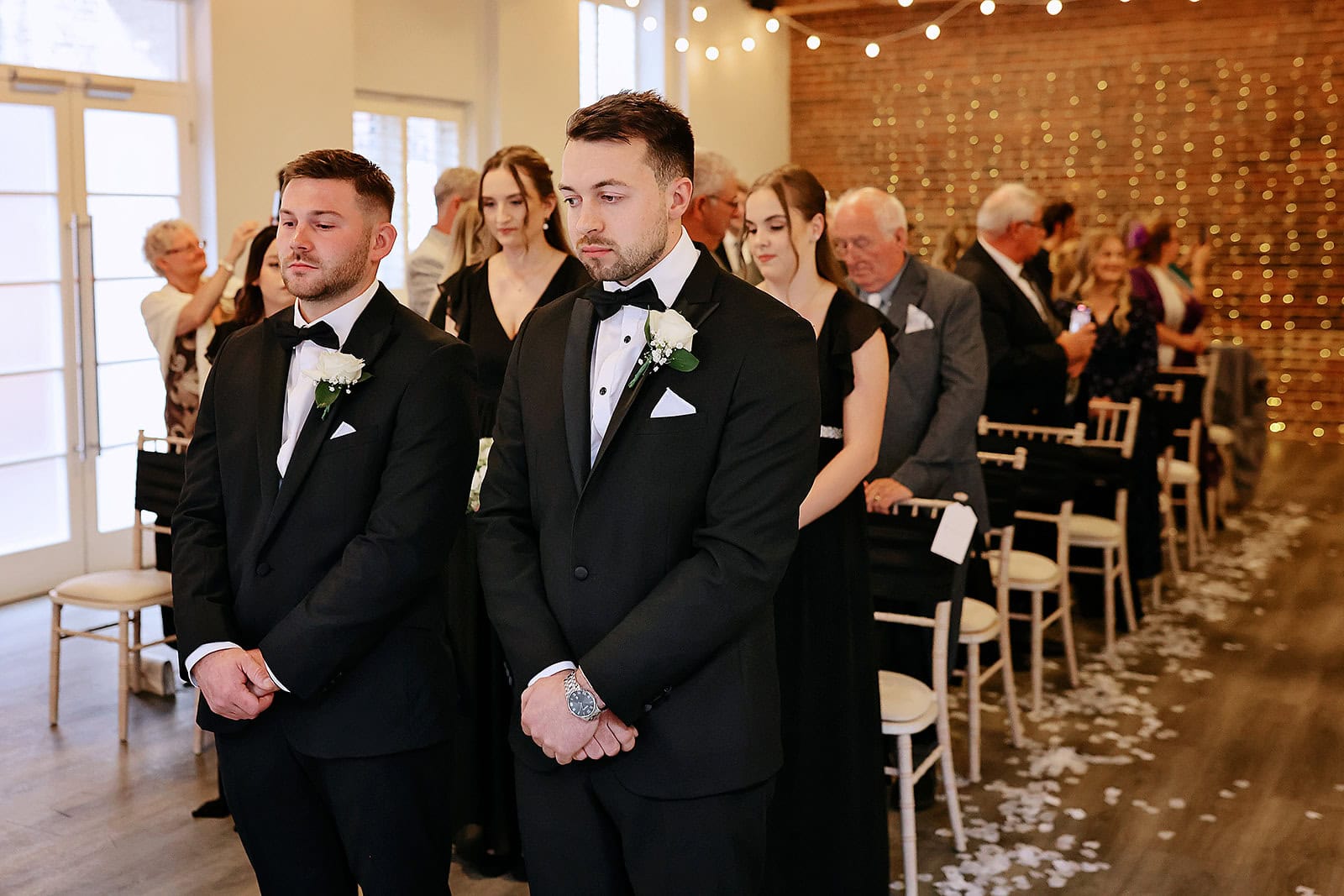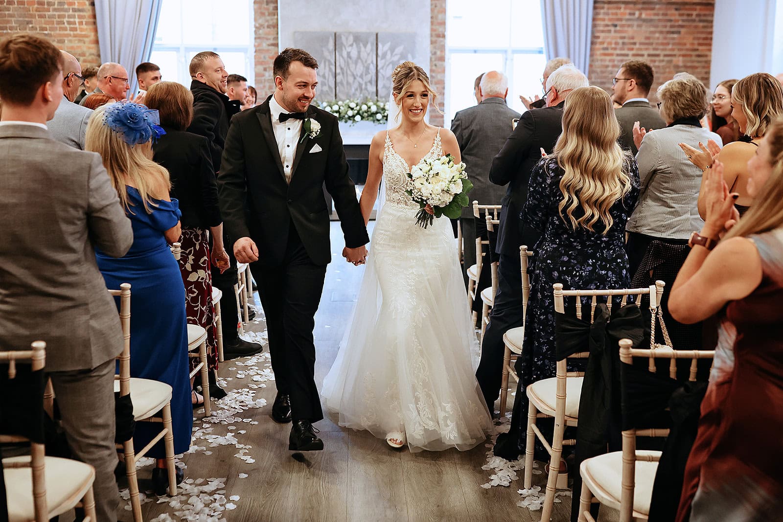 The ceremony took place in the beautifully light-filled Gallery space. As Katie walked down the aisle, the room fell into that quiet, emotional stillness that says everything about the moment. The rings had been placed under two unsuspecting guests chairs who became unexpected ring bearers.