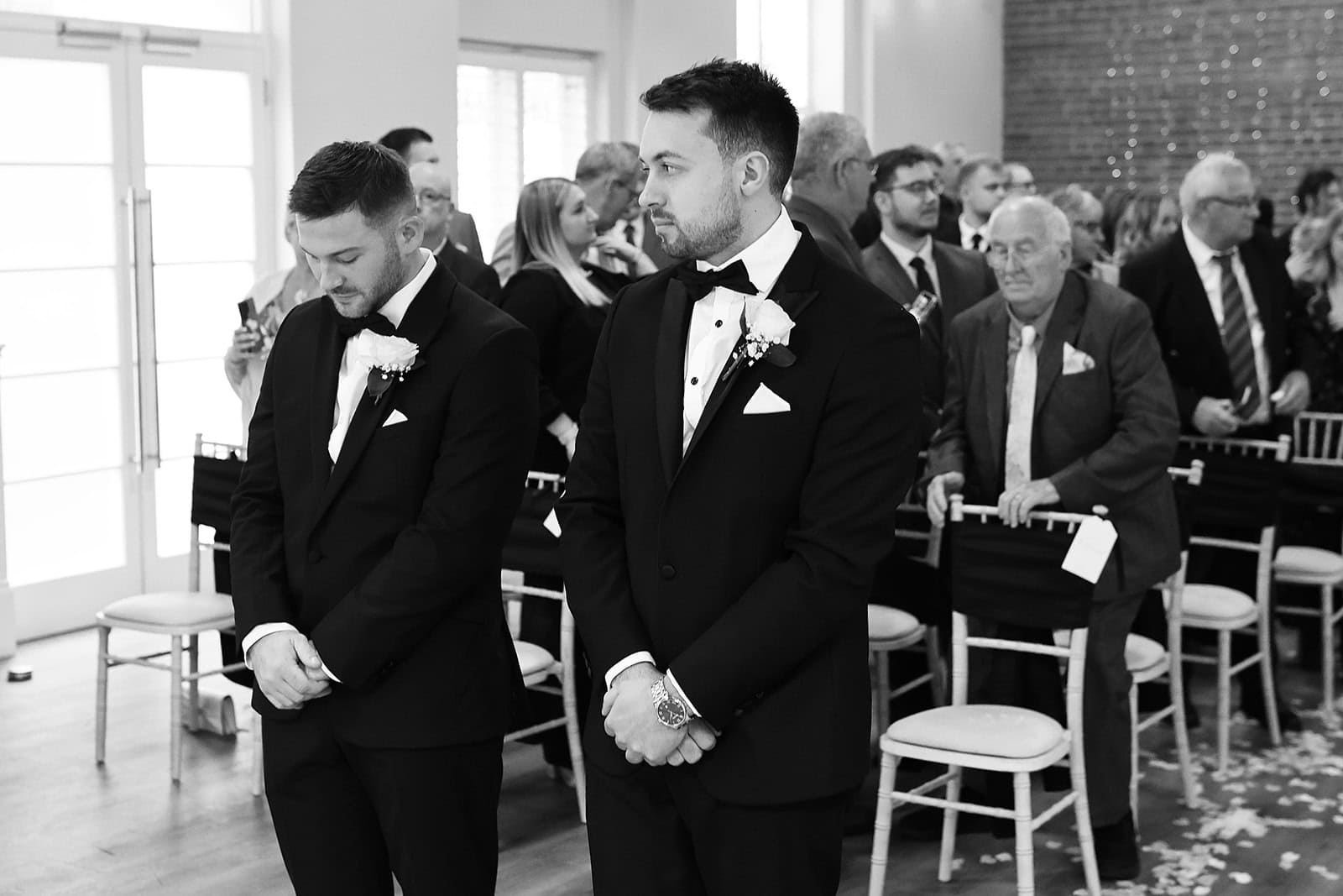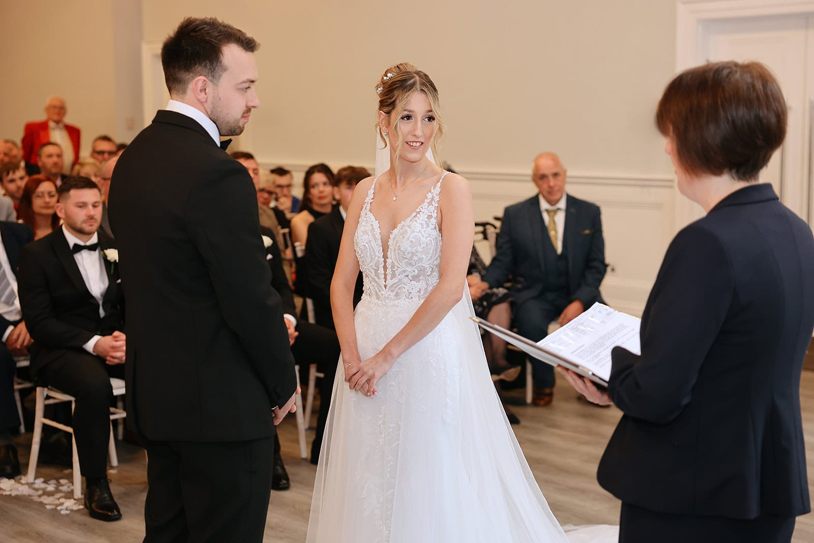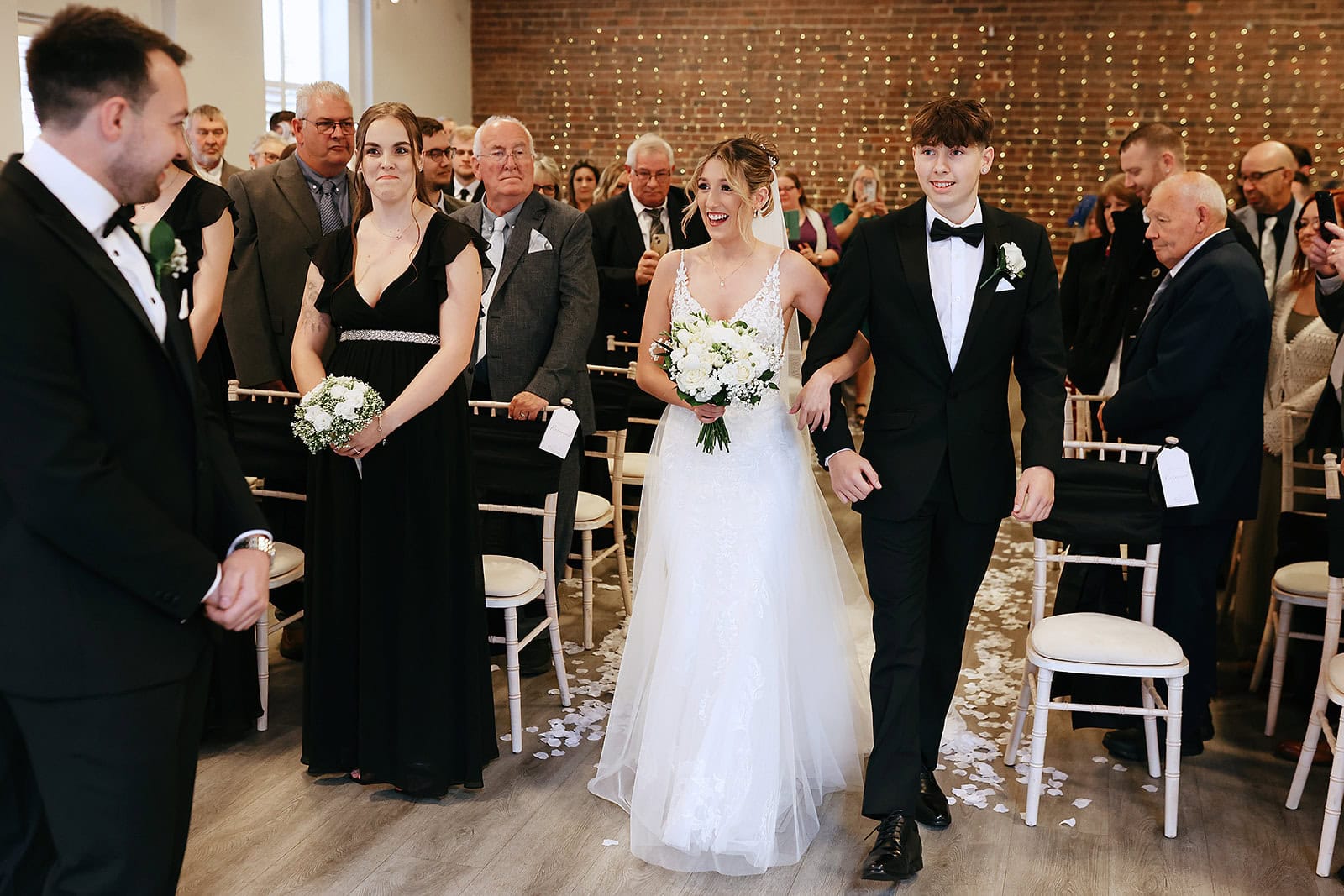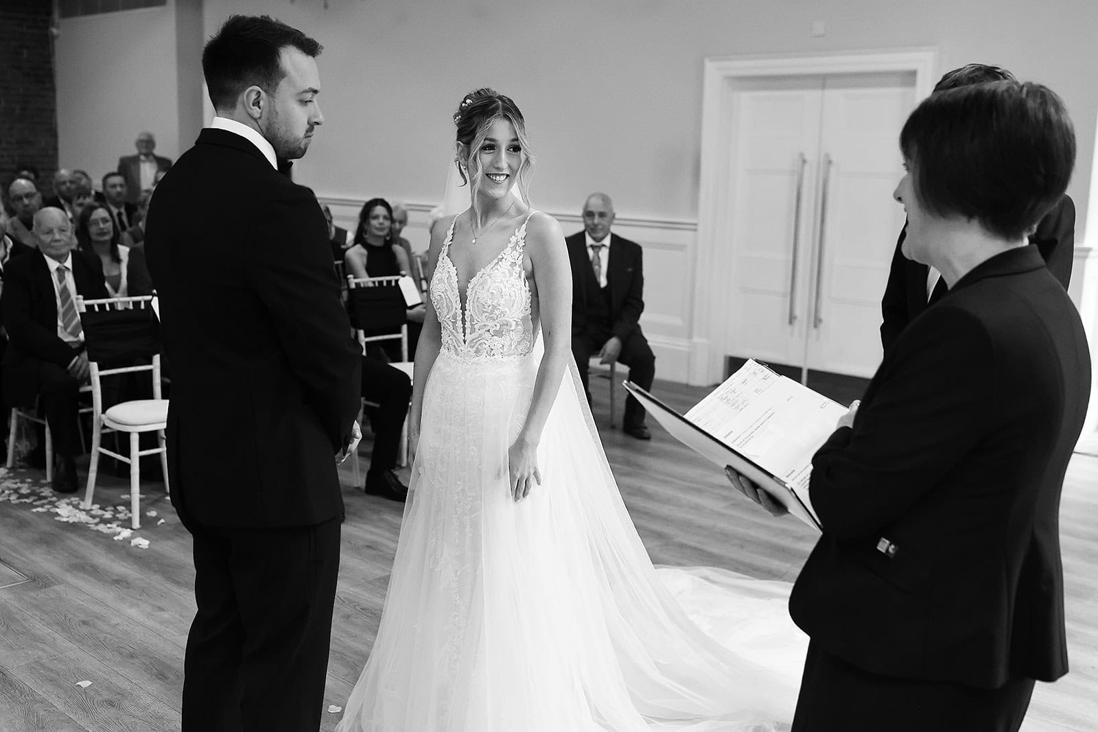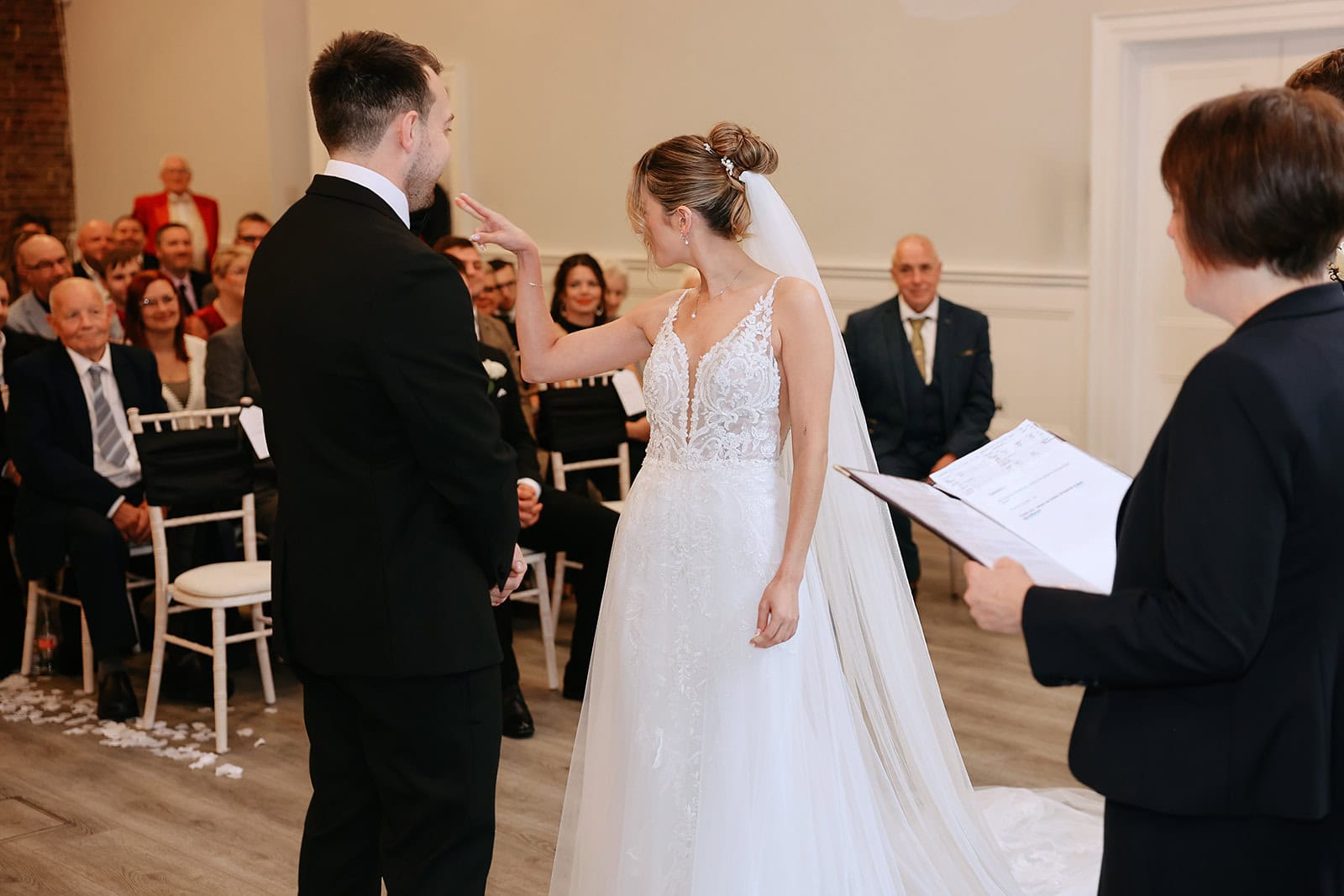 The ceremony took place in the beautifully light-filled Gallery space. As Katie walked down the aisle, the room fell into that quiet, emotional stillness that says everything about the moment. The rings had been placed under two unsuspecting guests chairs who became unexpected ring bearers.