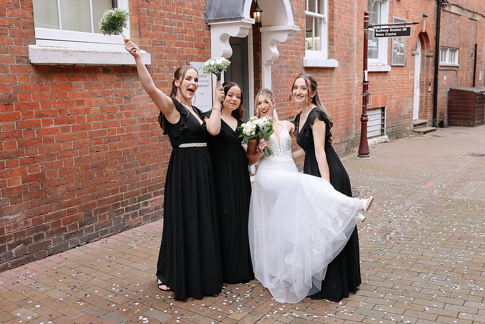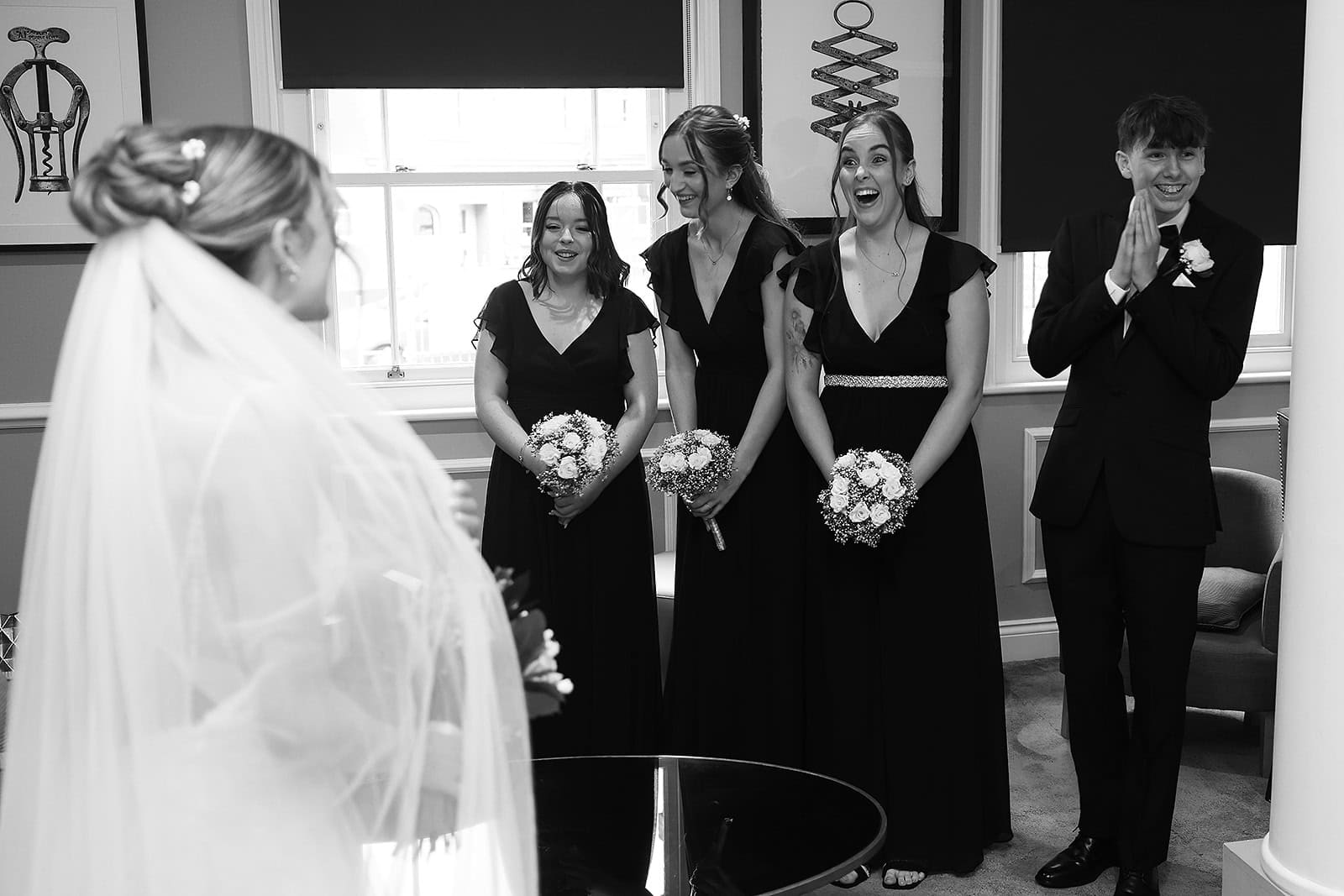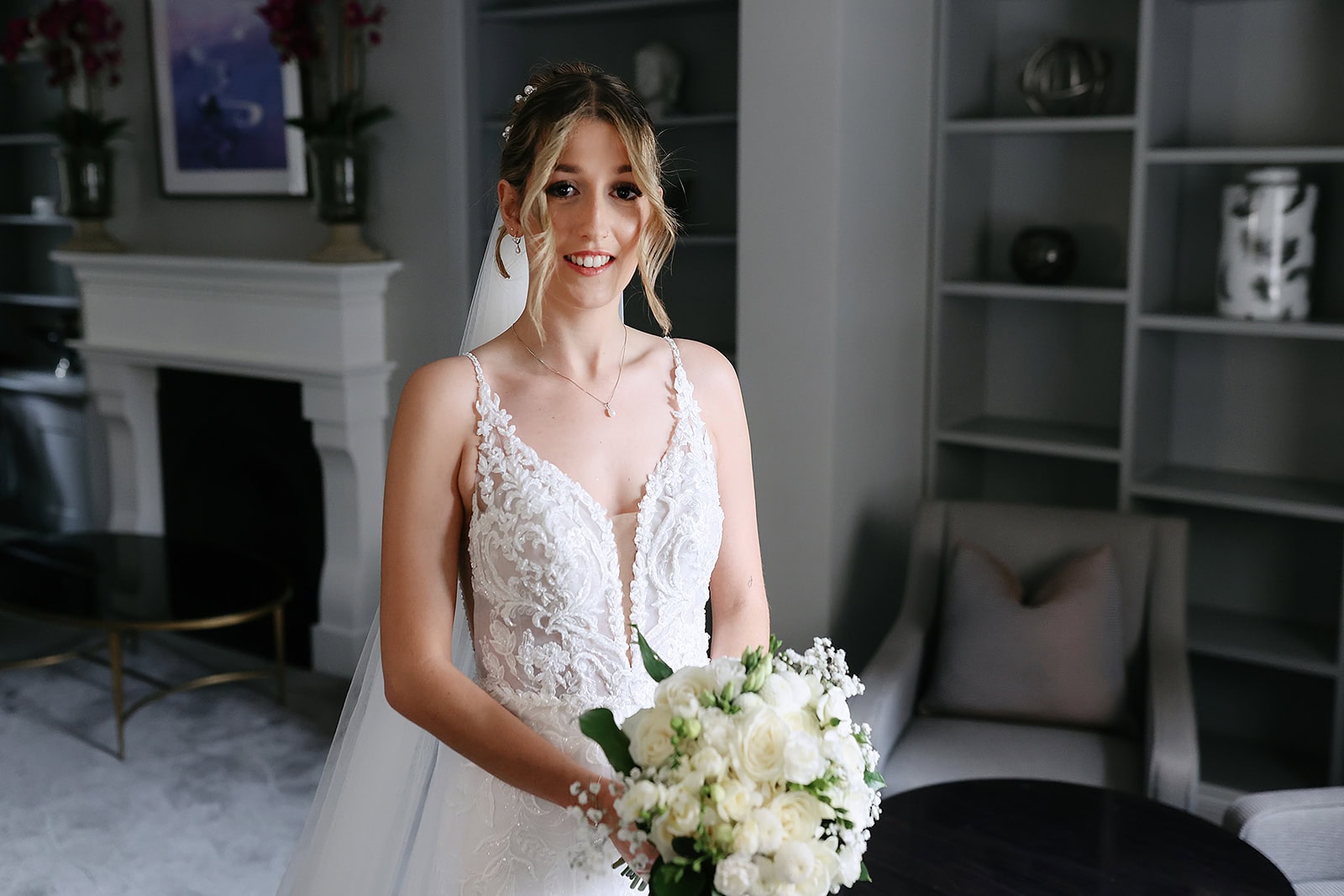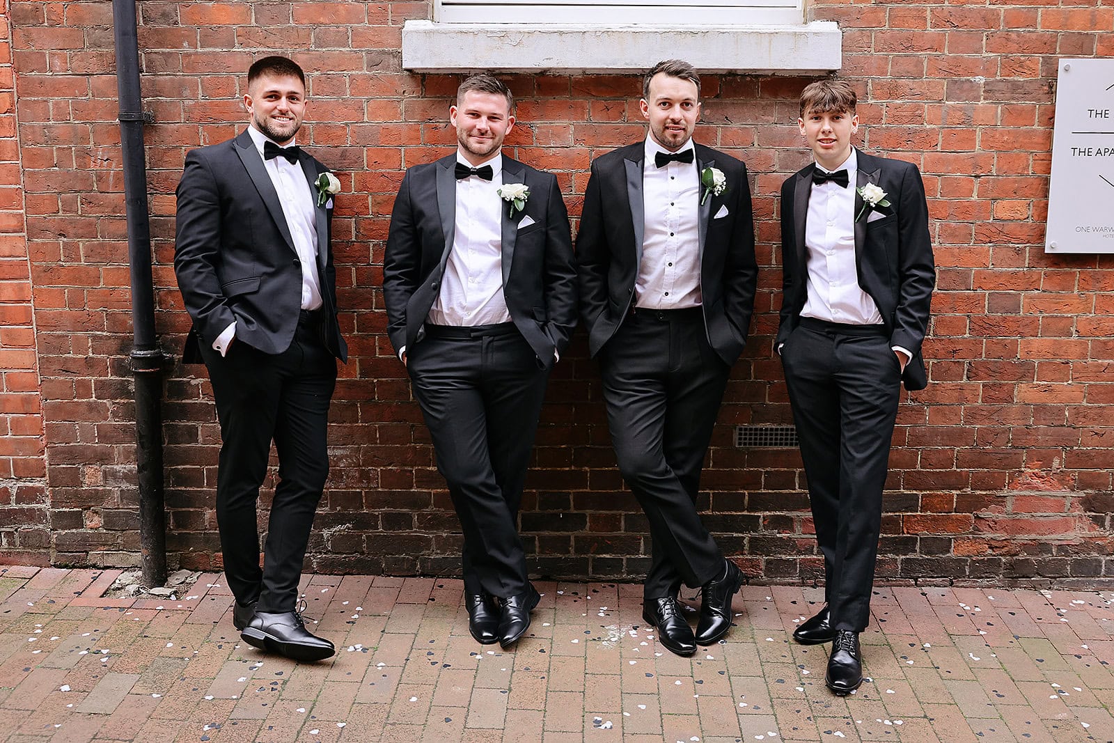 The day began at One Warwick Park, where both the bridal party and guests were welcomed by the hotel’s stylish interiors and softly lit spaces. Katie got ready with her bridesmaids in the one of the bright and spacious luxury suites, surrounded by Family, & Friends creating an excited morning buzz. Katie’s dress was modern, understated and full of movement — perfect for the relaxed, joyful feel of the day. Meanwhile, James and his groomsmen were just a short walk away, adjusting buttonholes before guests began to arrive.