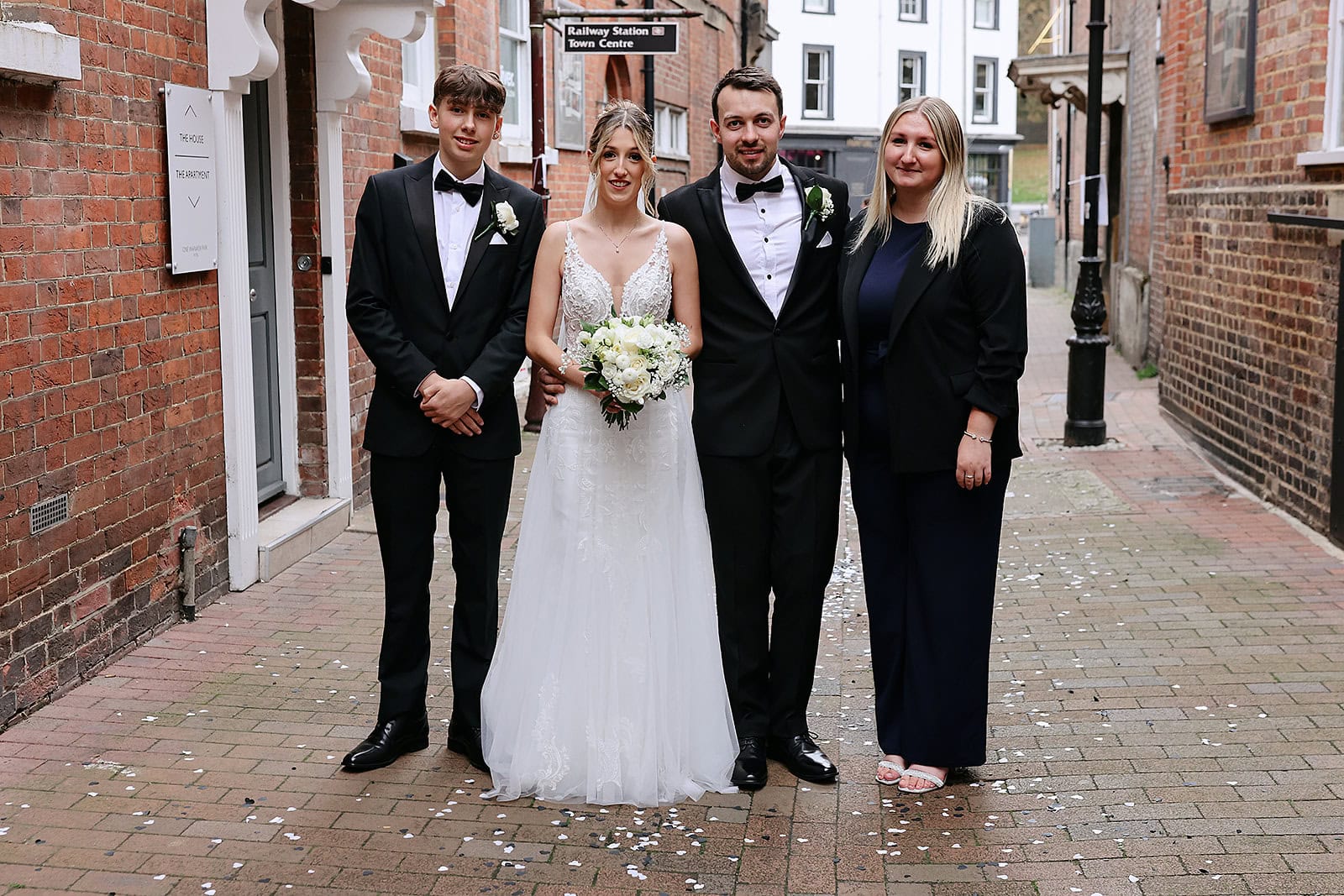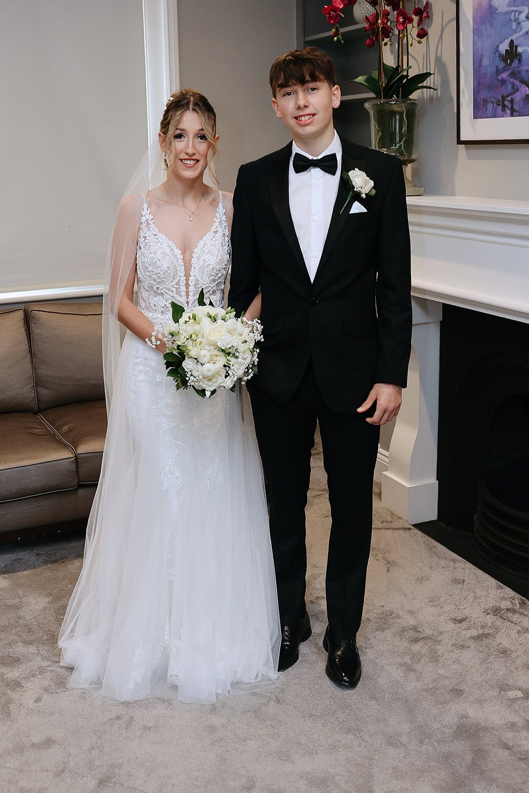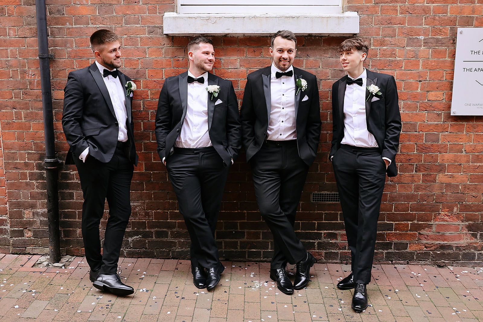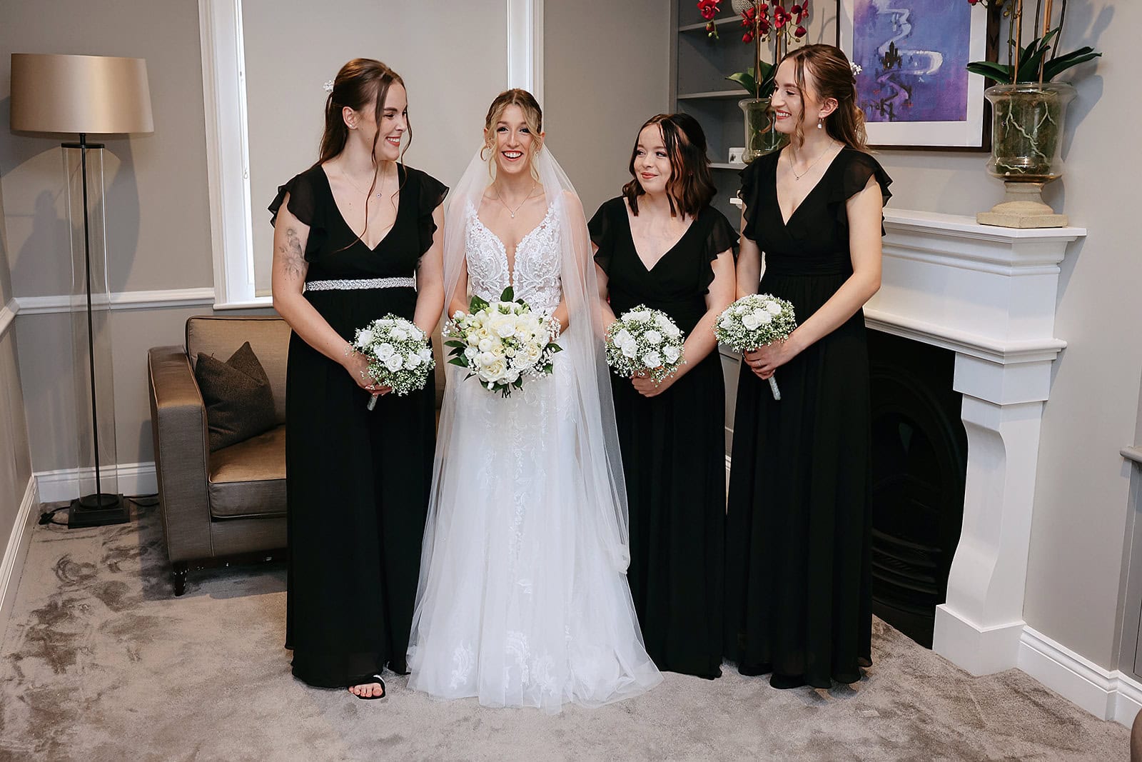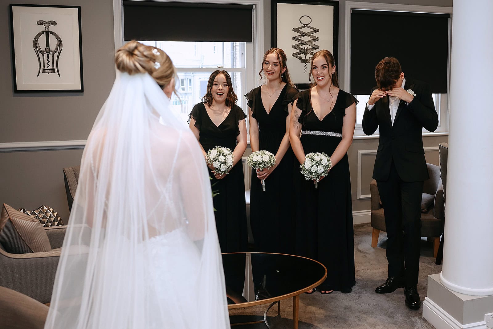 The day began at One Warwick Park, where both the bridal party and guests were welcomed by the hotel’s stylish interiors and softly lit spaces. Katie got ready with her bridesmaids in the one of the bright and spacious luxury suites, surrounded by Family, & Friends creating an excited morning buzz. Katie’s dress was modern, understated and full of movement — perfect for the relaxed, joyful feel of the day. Meanwhile, James and his groomsmen were just a short walk away, adjusting buttonholes before guests began to arrive.