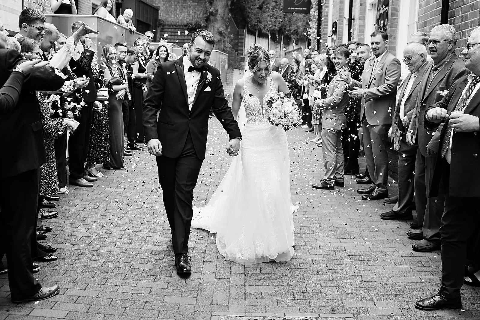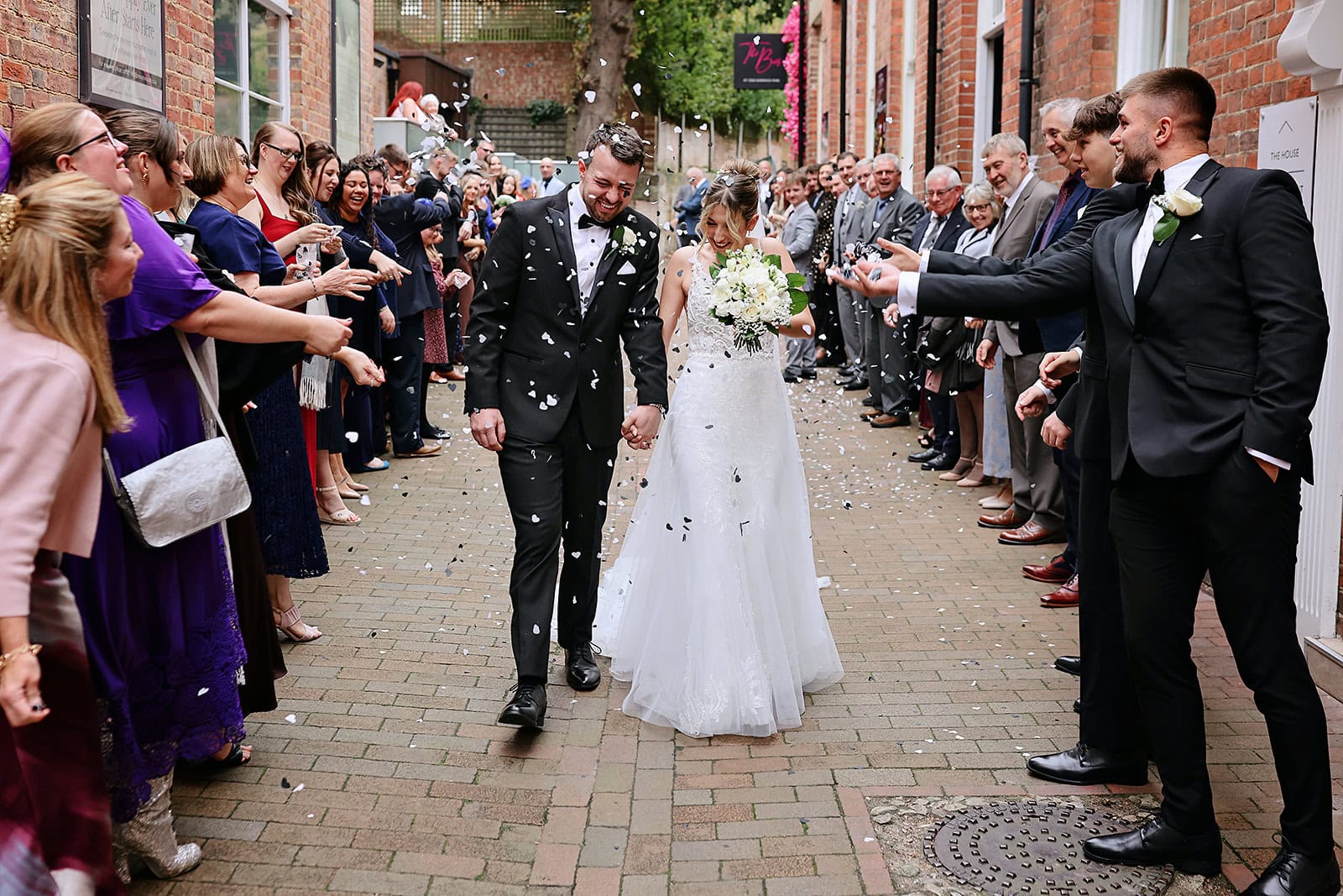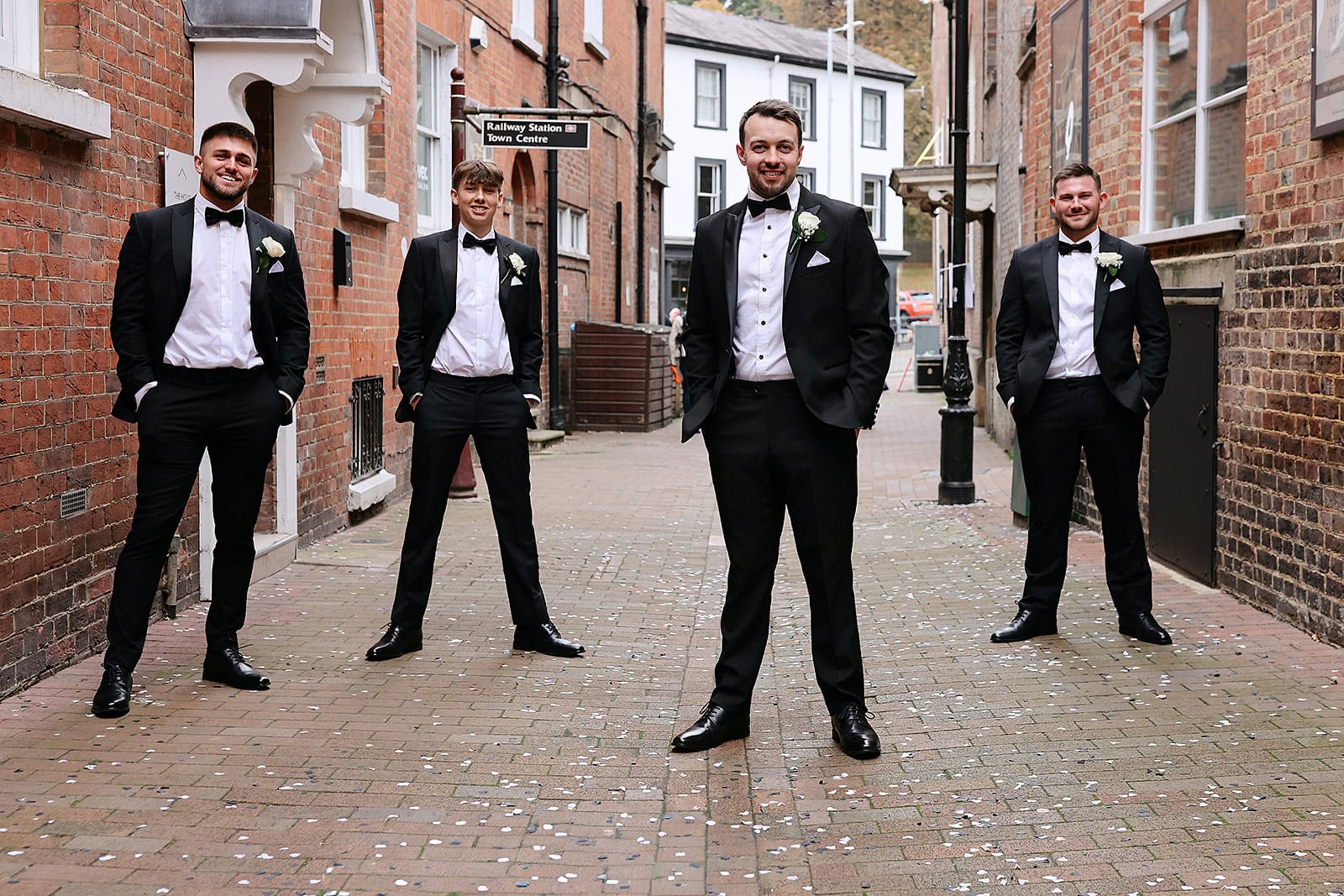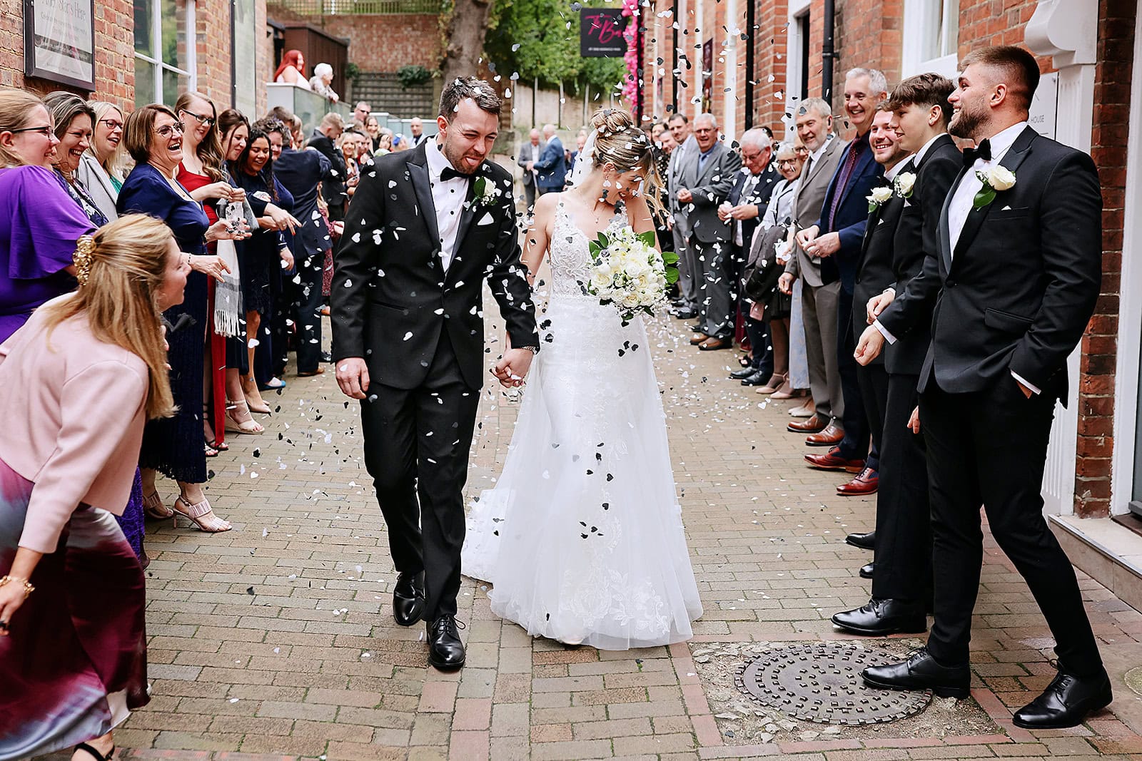 The day began at One Warwick Park, where both the bridal party and guests were welcomed by the hotel’s stylish interiors and softly lit spaces. Katie got ready with her bridesmaids in the one of the bright and spacious luxury suites, surrounded by Family, & Friends creating an excited morning buzz. Katie’s dress was modern, understated and full of movement — perfect for the relaxed, joyful feel of the day. Meanwhile, James and his groomsmen were just a short walk away, adjusting buttonholes before guests began to arrive.